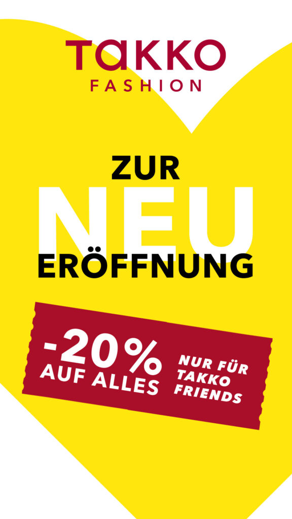 Zur Neueröffnung am 22. und 23. Januar darfst du dich auf 20 % Rabatt auf alle Artikel für Besitzer der Takko & Friends App freuen.